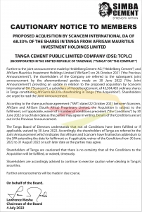 TANGA CEMENT PUBLIC LIMITED COMPANY DSE: TCPLC INCORPORATED IN THE UNITED REPUBLIC OF TANZANIA “TANGA” OR “THE COMPANY” Further to...